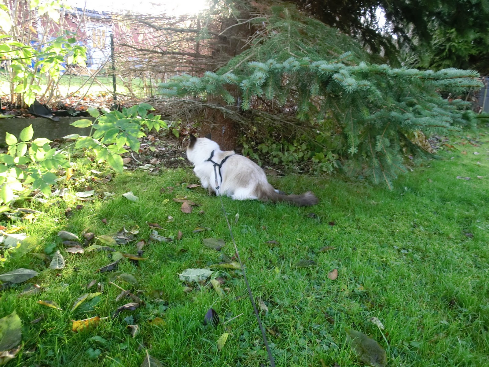 Vilken dag jag hade igår! Jag åkte till Skutskär och hälsade på Cecilia. Hon har norsk skogkatt och ragdollkatter. Jag föll pladask för alla. Så coola och mjuka och gosiga och ja... jätte jätte fina! De var så mjuka i pälsen så det nästan inte kändes att man klappade dem. Jag är ju så kattnödig ibland så jag håller på att gå åt, men igår fick jag stilla mitt behov lite. Eftersom de är innekatter så fick vi gå ut en lite sväng i koppel med några av dom. Det är som, Cecilia sa, att man går ut på kattens villkor. Jag fick hålla i skogkatterna först, mor och dotter. Ingen av dom var så sugen på att vara ute en längre stund. Så de ville gå in. Då tog jag över kopplet till en ragdollkatt. Den var lite mer äventyrlig och fick span på en fågel. Jag fick springa efter.... Sedan satt den under en gran en stund.